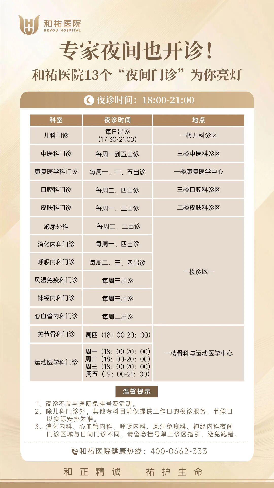 除兒科門診外,其他專科目前僅提供工作日的夜診服務節假日以實際安排為準